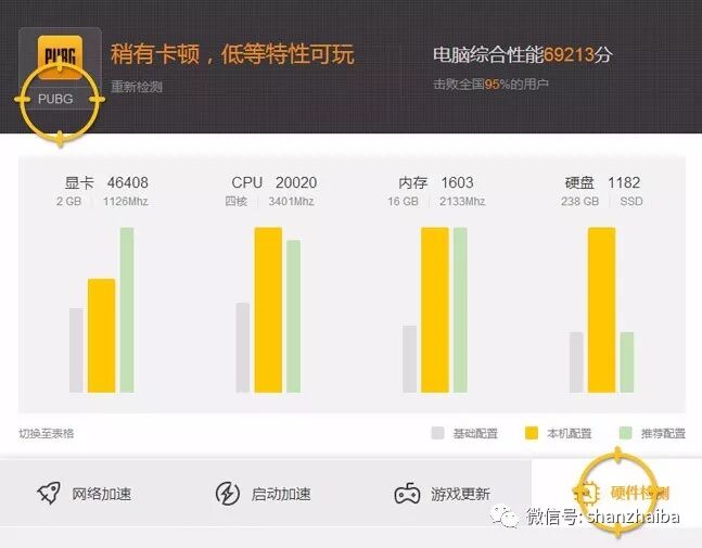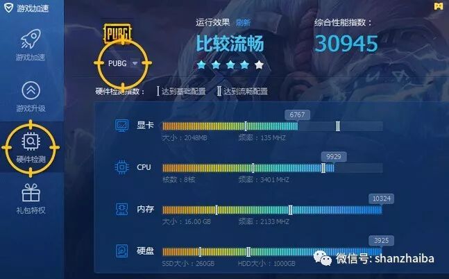 点击右下角的硬件检测,选择PUBG,检测硬件性能