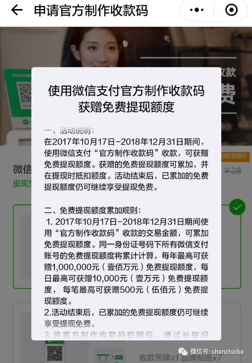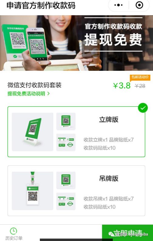这种方法是需要花费3.8(立牌)或者2.8(吊牌)的物料费用,而且拍照后通过相册扫码收款无法免费提现。必须要面对面收款。这个活动日期到2018年12月31日,以后不知道还有什么变化。